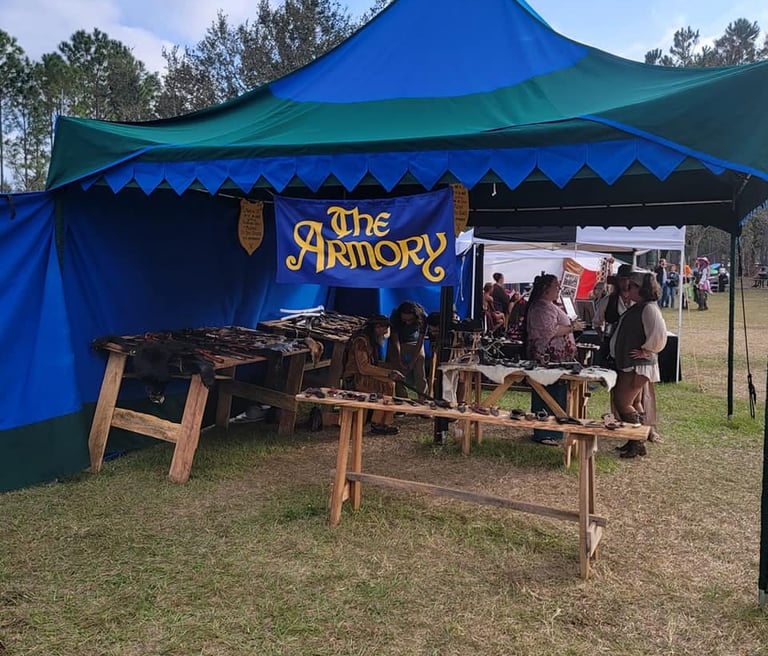 A specialty vendor offering a range of hand-crafted weapons and tools including hand-forged Damascus blades, hand-crafted flintknap knives and arrowheads, and a variety of foam weaponry for safe play and costuming. Their products span steel blades, spears, axes, and themed foam swords suitable for all ages. [Myakka Armory](https://www.myakkaarmory.com)